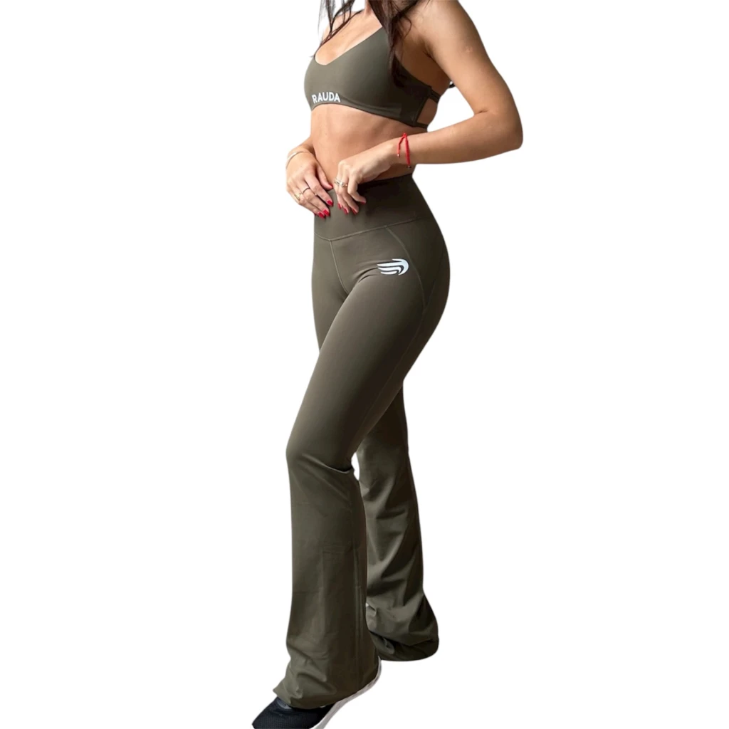 Este conjunto incluye un pantalón acampanado de tiro alto que estiliza la figura y un top cómodo y elástico que brinda el soporte justo para tus rutinas de yoga, pilates o entrenamientos suaves.