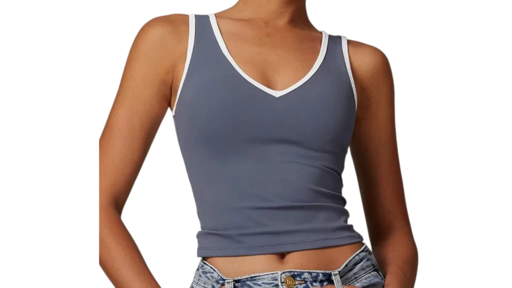 Musculosa con bordes blancos, cuello en V, estilo femenino y casual/deportivo.